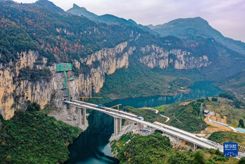 這是11月26日拍攝的位于重慶市酉陽(yáng)土家族苗族自治縣龔灘鎮(zhèn)境內(nèi)的阿蓬江大橋施工建設(shè)現(xiàn)場(chǎng)(無(wú)人機(jī)照片)。