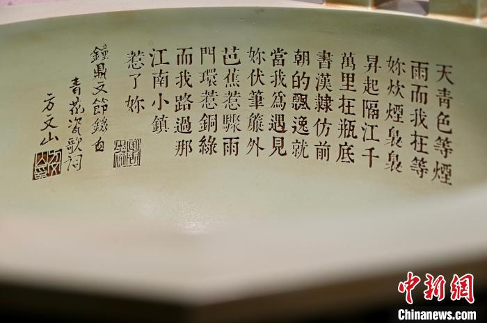 圖為龍泉青釉刻纏枝牡丹紋鳳尾尊瓷器。中新網(wǎng)記者 李志華 攝