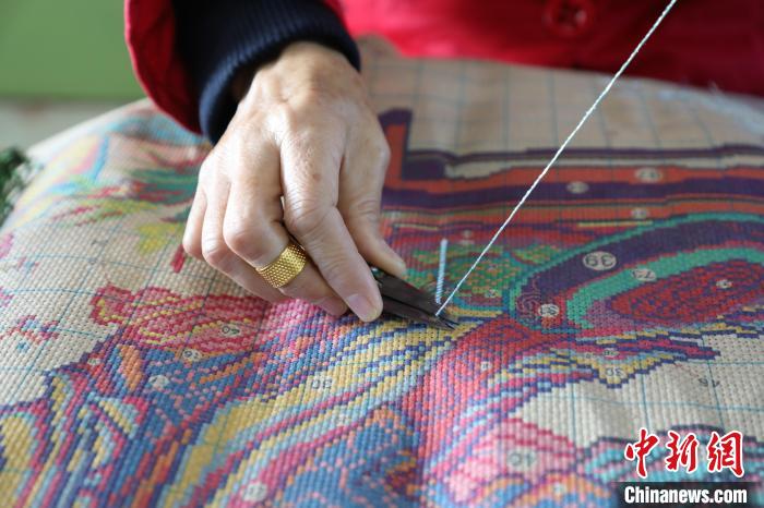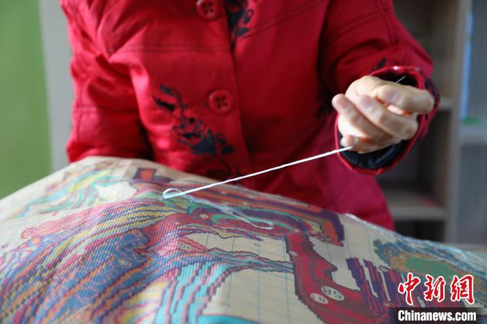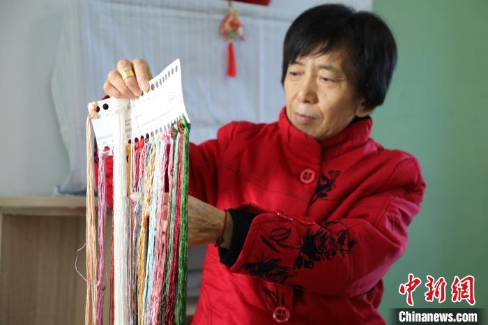 圖為趙衛(wèi)平正在選取十字繡彩線。劉延嶺 攝