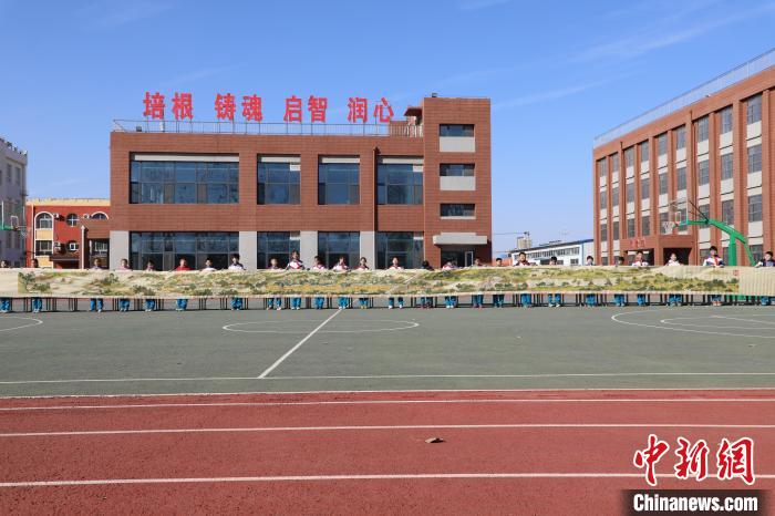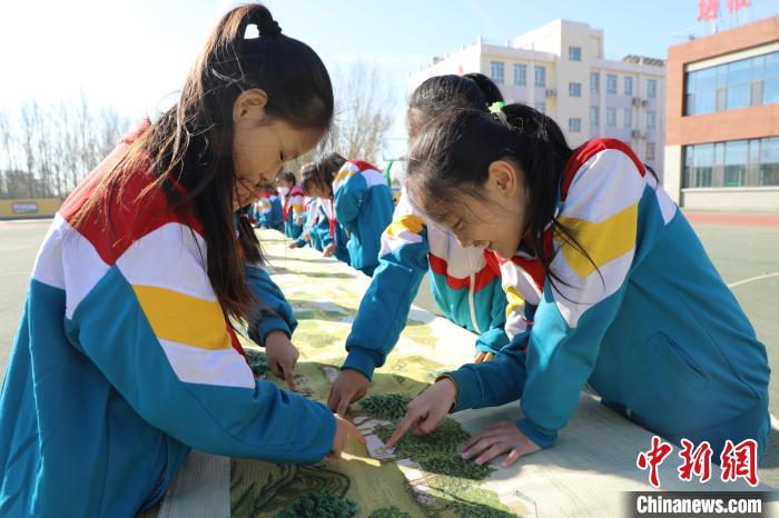 11月28日,學(xué)生在操場(chǎng)上觀看趙衛(wèi)平的十字繡作品《清明上河圖》。劉延嶺 攝