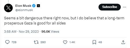 對于最新邀約,馬斯克在其旗下社交媒體平臺“X”上回應稱:“現(xiàn)在看起來有點危險,但我相信加沙的長期繁榮對各方都有好處?!?/p>