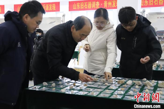 來自中國科學(xué)院、山東省文物考古研究院、北京大學(xué)、吉林大學(xué)等科研院所和高校的文物考古專家參觀山東省臨沂市沂水縣跋山遺址考古發(fā)掘成果展示。李明芮 攝