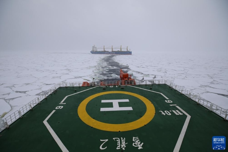 11月30日,“雪龍2”號在為“天惠”輪破冰引航。新華社記者 周圓 攝