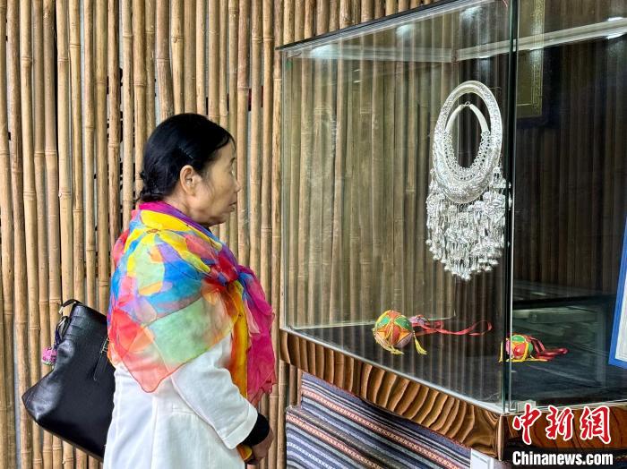 游客在隴鑒古寨參觀一個(gè)銀制的民族飾品。林潔琪 攝