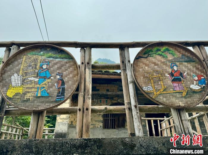 隴鑒古寨至今已有近百年歷史,圖為古民居的欄桿上掛著用簸箕繪制的壯族民俗畫(huà)。林潔琪 攝