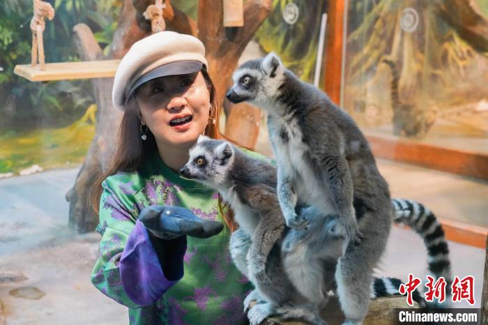 圖為文旅達(dá)人在西寧海洋館與環(huán)尾狐猴近距離互動(dòng)。馬銘言攝
