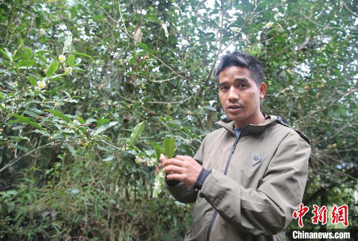 12月1日,景邁山芒景村布朗族村民桑達為記者介紹村中茶樹。中新社記者 黃興鴻 攝