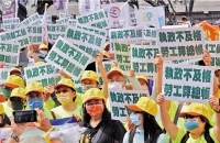 圖:12月1日,臺灣職場2023年度代表字調(diào)查出爐,勞方選擇“悶”字居多,資方選擇“缺”字居多。圖為今年5月1日,臺灣民眾集會怒斥民進黨當局漠視勞工權(quán)益。\資料圖片