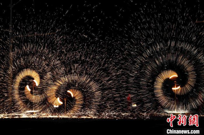 工作人員表演打鐵花時(shí)火花四濺渲染了冬日夜空。王海濱 攝