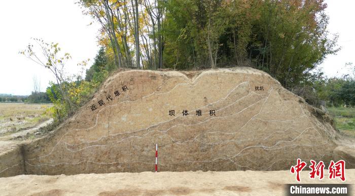 湖北屈家?guī)X遺址新發(fā)現(xiàn)的鄭畈水壩剖面。(湖北省文物考古研究院供圖)