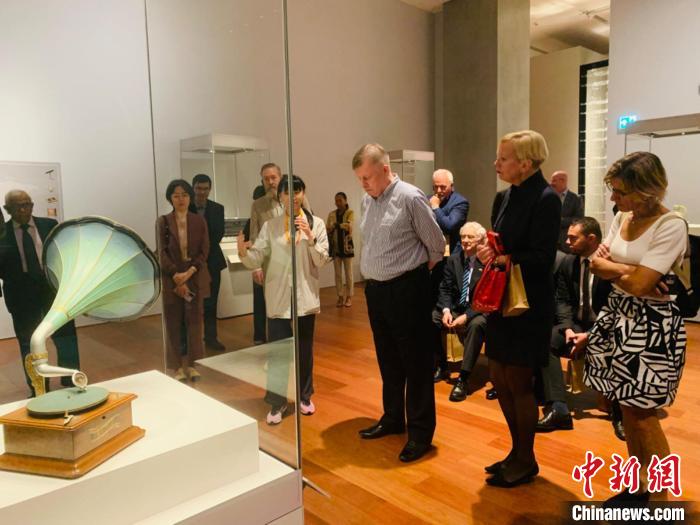 香港新西蘭商會主席大衛(wèi)·惠特拉姆(前排右三)在留聲機展品旁側耳傾聽。中新社記者 戴小橦攝