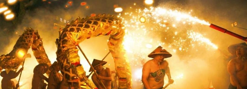 夜幕降臨,廣西德保街道上鼓樂(lè)喧天,四條彩色祥龍?jiān)谖椠垘煹膿]舞下,在無(wú)盡煙花中來(lái)回翻騰,追逐著面前的龍珠。
