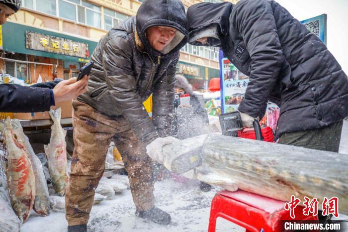 在撫遠(yuǎn)海峰魚行門前,老板王海峰揮舞鐵鋸,將一條重達(dá)30多斤的鱘鰉魚鋸開售賣,他說:“鱘鰉魚全身都是寶,冷水養(yǎng)殖,魚肉肥美,沒土腥味,因此很受歡迎,從元旦到過年能賣出上千斤?!?/p>