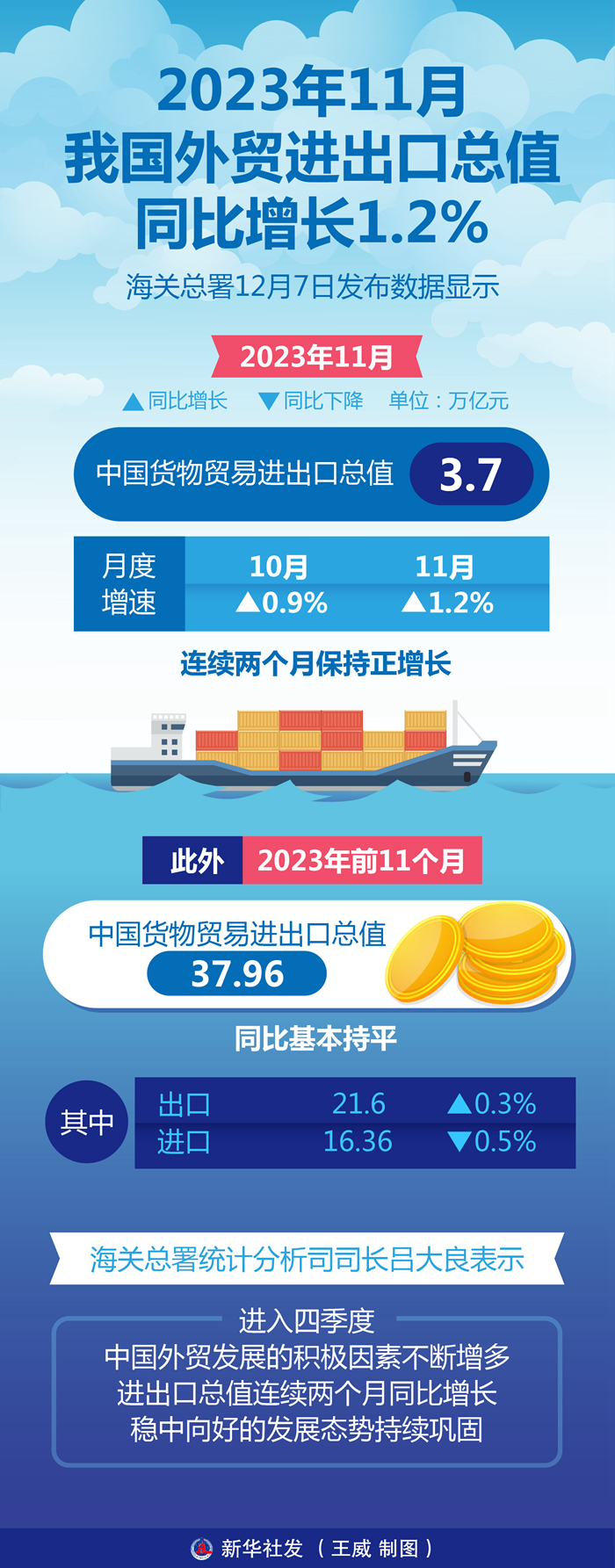 新華社北京12月7日電(記者魏弘毅)海關(guān)總署7日發(fā)布數(shù)據(jù)顯示,繼10月份我國貨物貿(mào)易進出口增速由前期的同比下降轉(zhuǎn)為增長0.9%后,11月份的貨物貿(mào)易進出口增速進一步提升至1.2%,進出口總值為3.7萬億元,外貿(mào)穩(wěn)中向好態(tài)勢進一步鞏固。
