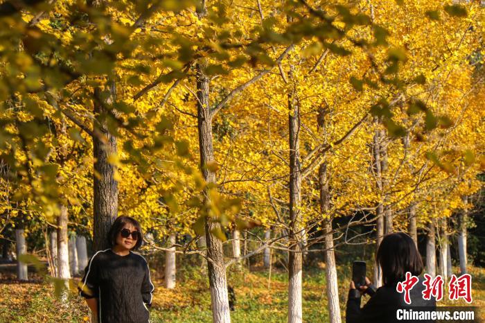 圖為游客在南昌縣鳳凰溝風(fēng)景區(qū)的金色銀杏“海洋”中拍照“打卡”。虞亮亮 攝