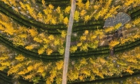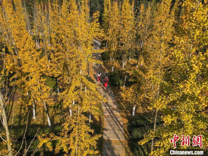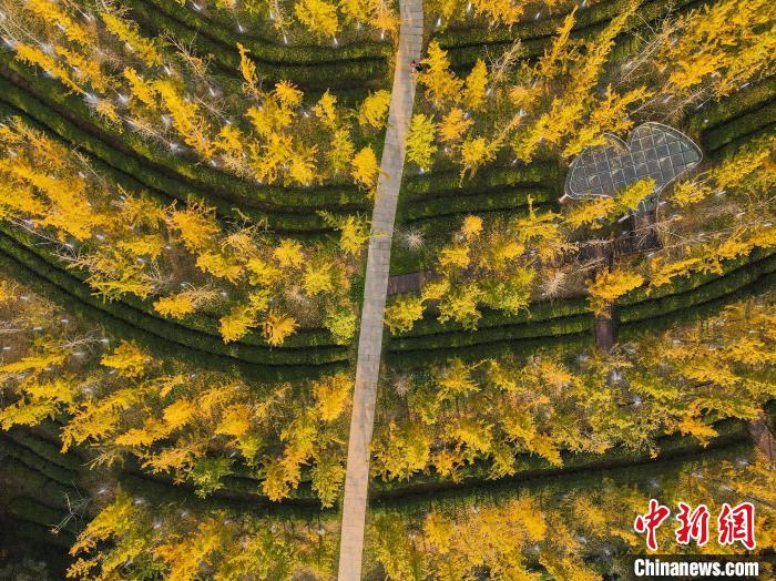 圖為航拍南昌縣鳳凰溝風(fēng)景區(qū)的銀杏樹,在暖陽(yáng)映照下,變成了一片金黃色的“海洋”,游客漫步其中欣賞美景。虞亮亮 攝