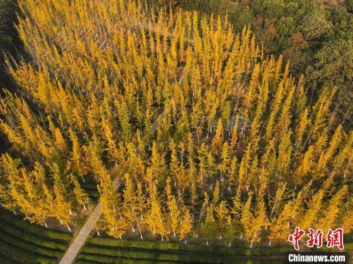 圖為航拍南昌縣鳳凰溝風(fēng)景區(qū)的銀杏樹,在暖陽(yáng)映照下,變成了一片金黃色的“海洋”。虞亮亮 攝