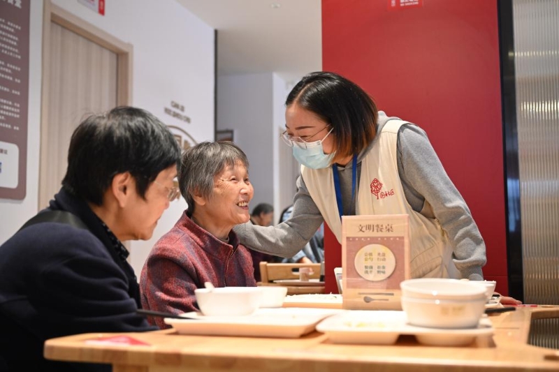 11月16日,社區(qū)工作人員在福建省福州市鼓樓區(qū)慶城社區(qū)長者食堂內(nèi)與用餐老人交流。新華社記者 姜克紅 攝