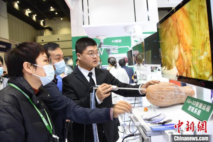 圖為工作人員在展示腹腔鏡5G應(yīng)用成果?!⊥跤?攝