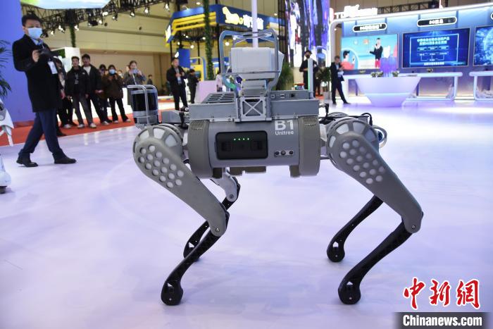 圖為展覽展示區(qū)的5G智能四腿機(jī)器人?! ⊥跤?攝
