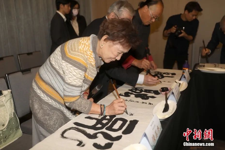 12月8日,2023海峽兩岸年度漢字評(píng)選活動(dòng)在臺(tái)北揭曉結(jié)果,“融”字當(dāng)選。圖為與會(huì)嘉賓書寫“融”字。中新社記者 陳小愿 攝