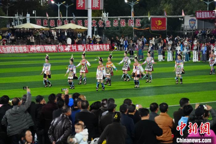 綠茵場上,兩隊球員的汗水濕透了衣衫,但拼勁兒絲毫不減;觀眾席不時傳出歡呼聲和敲鑼打鼓聲為兩隊球員加油助威。中場休息,當(dāng)?shù)囟弊逋泶┟褡宸棻硌萘藰O具侗族風(fēng)格特色的節(jié)目。
