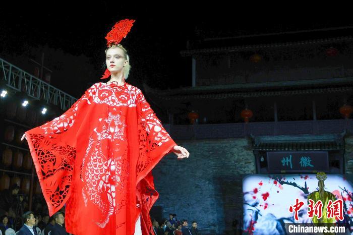 11月7日,2023黃山市首屆國際藝術(shù)季暨徽州古城非遺國際時裝秀在歙縣舉行。圖為外籍模特在展示吳笑梅設(shè)計的徽州剪紙主題時裝。葉智成 攝