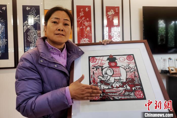 11月30日,安徽省級非遺項目徽州剪紙代表性傳承人吳笑梅在展示其創(chuàng)作的套色剪紙作品。張強 攝