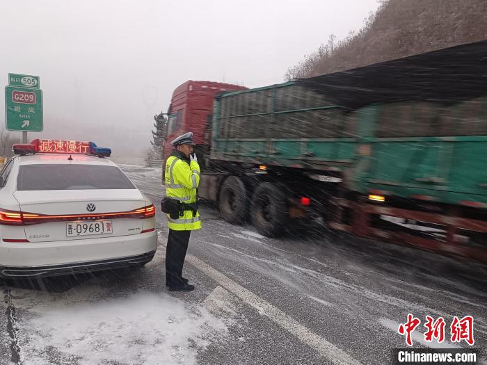 10日下午,山西境內(nèi)高速公路交通安全受降雪影響明顯。為充分兼顧通行安全與出行便利兩方面需求,山西高速交警先行管控“兩客一?!敝攸c車輛,通過增大路面巡邏頻率確保其他車輛正常通行。