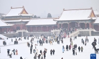 12月14日,游人在雪中游覽山西平遙古城。