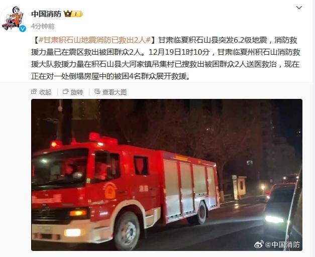 中新網(wǎng)12月19日電 據(jù)國家消防救援局官方微博消息,甘肅臨夏積石山縣突發(fā)6.2級地震,消防救援力量已在震區(qū)救出被困群眾2人。