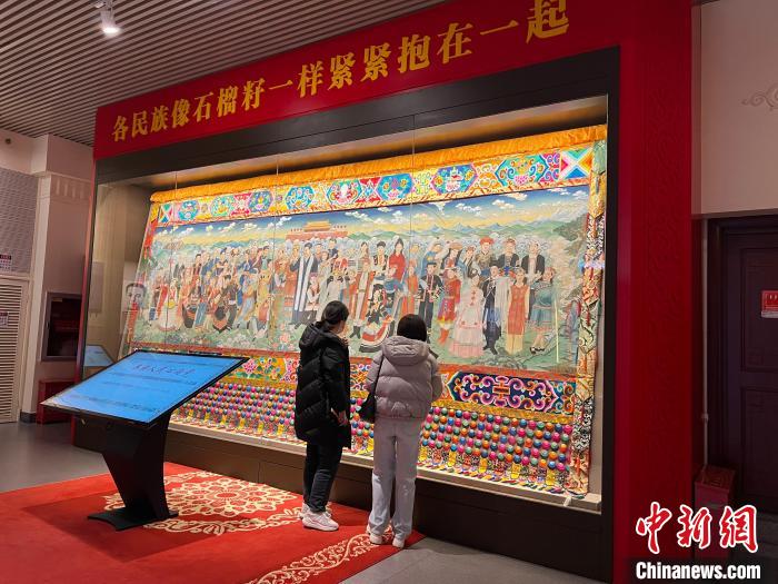 《民族團(tuán)結(jié)一家親》運用了世界級非物質(zhì)文化遺產(chǎn)——黃南熱貢唐卡藝術(shù),整個作品在熱貢藝術(shù)發(fā)祥地青海省同仁縣歷經(jīng)2年繪制創(chuàng)作完成。圖為現(xiàn)場人士參觀唐卡《民族團(tuán)結(jié)一家親》。吳亞凡 攝