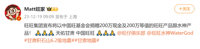 12月19日,旺旺集團(tuán)宣布向甘肅捐贈(zèng)200萬元及200萬等值產(chǎn)品,詳情如下: