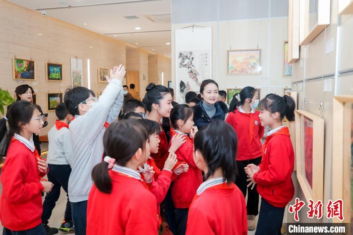 學(xué)生們參觀首屆海峽兩岸大同小學(xué)學(xué)生繪畫作品展。長沙市臺辦供圖
