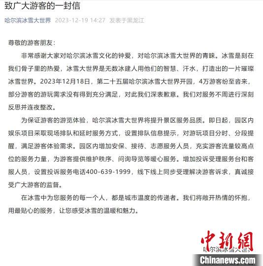 哈爾濱冰雪大世界《致廣大游客的一封信》原文