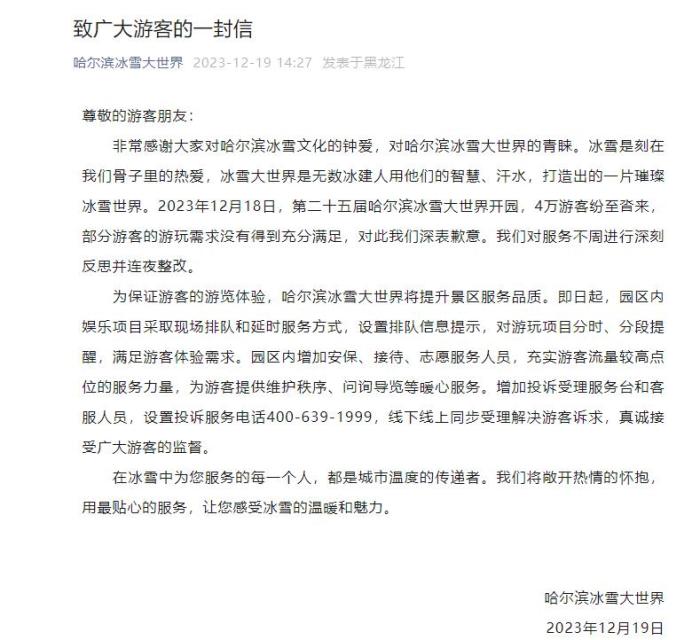 中新網(wǎng)12月19日電 哈爾濱冰雪大世界官方微信19日發(fā)布《致廣大游客的一封信》,信中表示,12月18日,第二十五屆哈爾濱冰雪大世界開園,4萬游客紛至沓來,部分游客的游玩需求沒有得到充分滿足,哈爾濱冰雪大世界對此深表歉意,對服務(wù)不周進(jìn)行深刻反思并連夜整改。