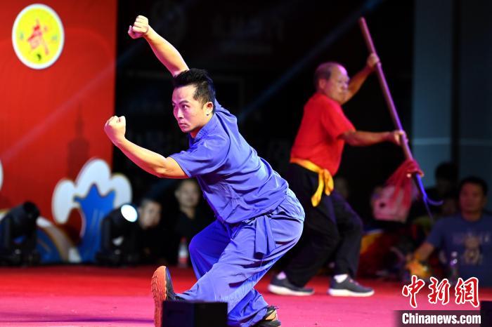 10月8日晚,第十五屆海峽兩岸(福建·龍文)中華武術(shù)大家練在福建省漳州市龍文區(qū)舉行。圖為臺(tái)灣耀嶙武術(shù)團(tuán)的《崩步螳螂》和臺(tái)灣浮洲仔勤習(xí)堂的《單鉤》表演。中新社記者 張金川 攝