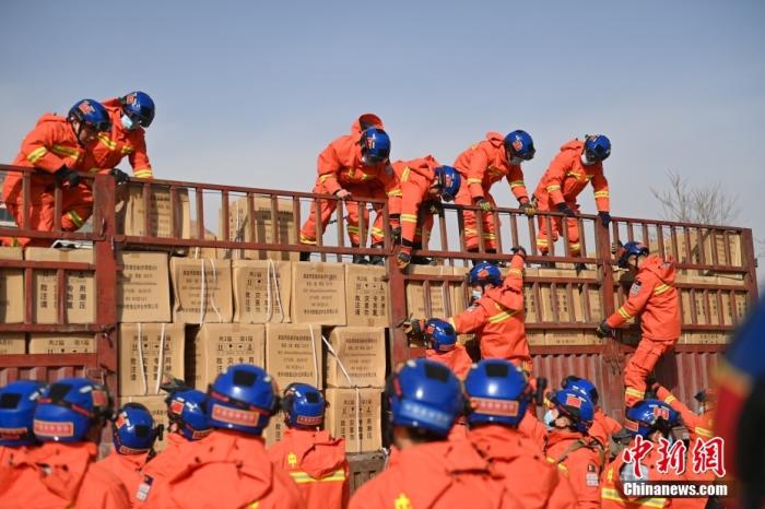 12月19日,甘肅省臨夏州積石山縣大河家鎮(zhèn),甘肅省森林消防總隊隊員搬運救災(zāi)物資。 中新社記者 李亞龍 攝