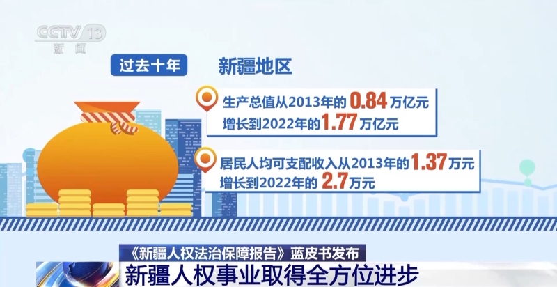 會(huì)議期間,還舉行了《新疆人權(quán)法治保障報(bào)告》藍(lán)皮書揭幕儀式。過去十年,新疆地區(qū)生產(chǎn)總值從2013年的0.84萬億元增長到2022年的1.77萬億元,居民人均可支配收入從2013年的1.37萬元增長到2022年的2.7萬元。