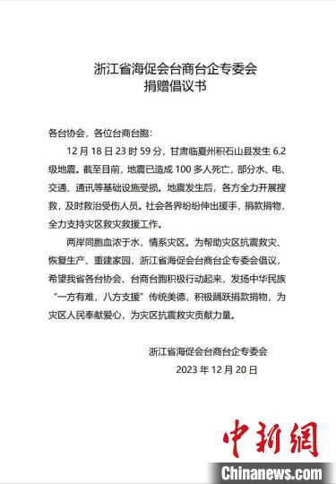 “兩岸同胞血濃于水,情系災(zāi)區(qū)……希望各臺協(xié)會、臺商臺胞積極行動起來,發(fā)揚(yáng)中華民族‘一方有難,八方支援’傳統(tǒng)美德,為災(zāi)區(qū)人民奉獻(xiàn)愛心?!?2月20日,浙江省海促會臺商臺企專委會第一時間向廣大臺商臺企發(fā)出倡議。