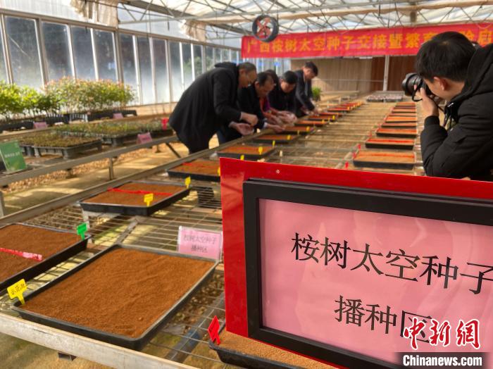 中新網(wǎng)南寧12月21日電(黃令妍 謝樂 張雷 王建忠)12月21日,廣西桉樹太空種子交接暨繁育試驗啟動儀式在南寧舉行。廣西國有東門林場接收桉樹太空種子,并組織播種,開展種子萌發(fā)試驗。
