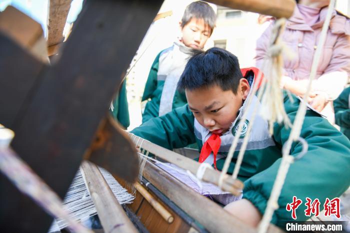 小學(xué)生體驗(yàn)夏布織造技藝。中新網(wǎng)記者楊華峰攝
