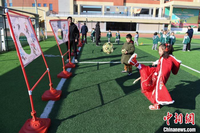 小學(xué)生體驗(yàn)蹴鞠。中新網(wǎng)記者 楊華峰 攝