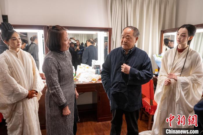 莫言觀看首演后與導(dǎo)演林叢和演員陸璐、孫翌琳交流。史春陽攝