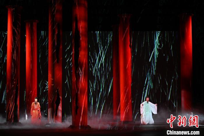 空靈、流暢、簡約的舞美風(fēng)格,營造出極具東方審美意境的戲劇空間。舞臺上,靈感來自故宮大殿的八根紅色立柱構(gòu)建起整個(gè)表演空間,多媒體的數(shù)字影像協(xié)助構(gòu)建起跨越時(shí)間的空間感。整個(gè)舞臺隨著場景的轉(zhuǎn)換“絲滑”流動(dòng),打破了真實(shí)與想象的邊界,在實(shí)與虛、明與暗之間實(shí)現(xiàn)連接和共融。