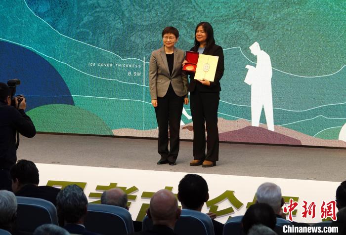 12月15日,第五屆“世界考古論壇·上?!痹谏虾4髮W(xué)開幕,開幕式上宣布授予著名考古學(xué)家、北京大學(xué)嚴(yán)文明教授第五屆“世界考古論壇終身成就獎(jiǎng)”。上海市副市長劉多頒獎(jiǎng),嚴(yán)文明先生弟子、復(fù)旦大學(xué)文物與博物館系秦小麗教授(右)代為領(lǐng)獎(jiǎng)。中新網(wǎng)記者 孫自法 攝