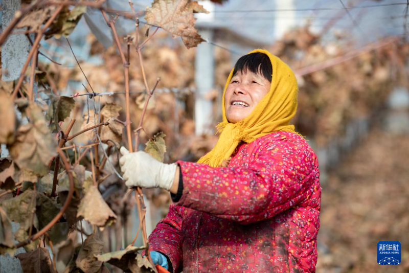 12月23日,在江蘇省興化市林湖鄉(xiāng)鐵陸村,農(nóng)戶在生態(tài)葡萄園內(nèi)給葡萄修枝。