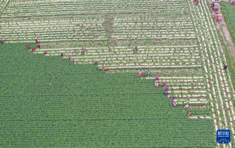 12月22日,四川省眉山市東坡區(qū)松江鎮(zhèn)三壩村村民在采收白蘿卜(無(wú)人機(jī)照片)。