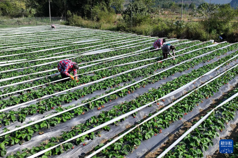 12月22日,廣西河池市羅城仫佬族自治縣四把鎮(zhèn)的農(nóng)民在管護(hù)草莓(無(wú)人機(jī)照片)。