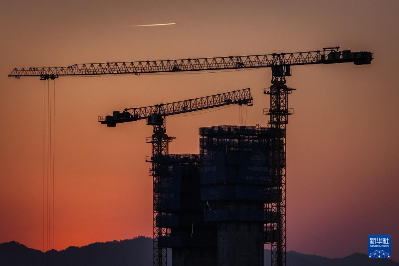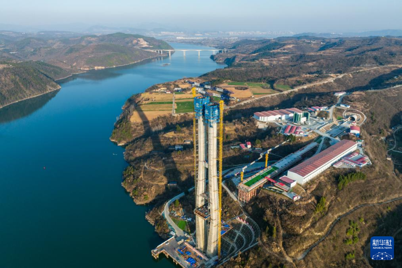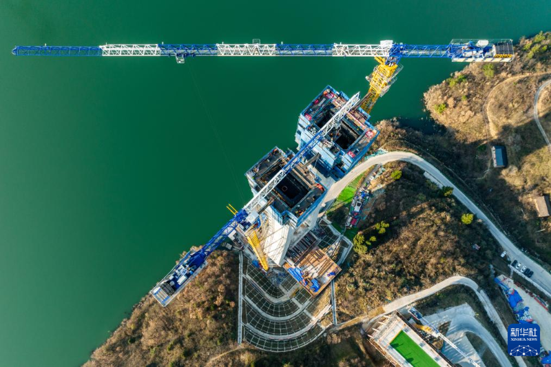12月24日拍攝的漢江特大橋兩岸主塔施工現(xiàn)場(chǎng)(無(wú)人機(jī)照片)。